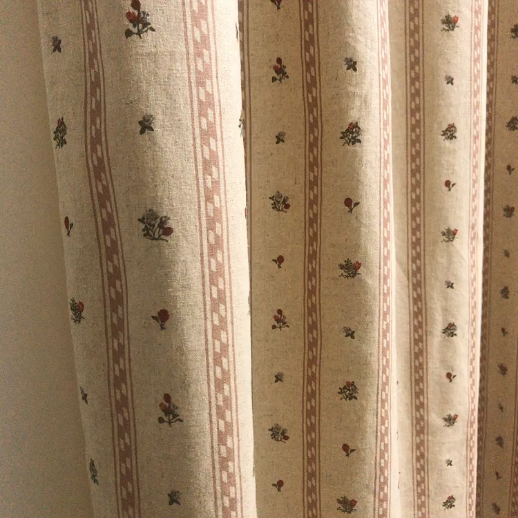 This curtain features soft vertical stripes in dusty pink tones, accented with delicate floral motifs in muted red and deep khaki green. Set against a warm natural beige background with a subtle vintage look, the design feels calm and balanced, blending gentle structure with romantic detail. The restrained stripe pattern adds rhythm and depth without overwhelming the space, creating a look that feels both traditional and quietly contemporary.