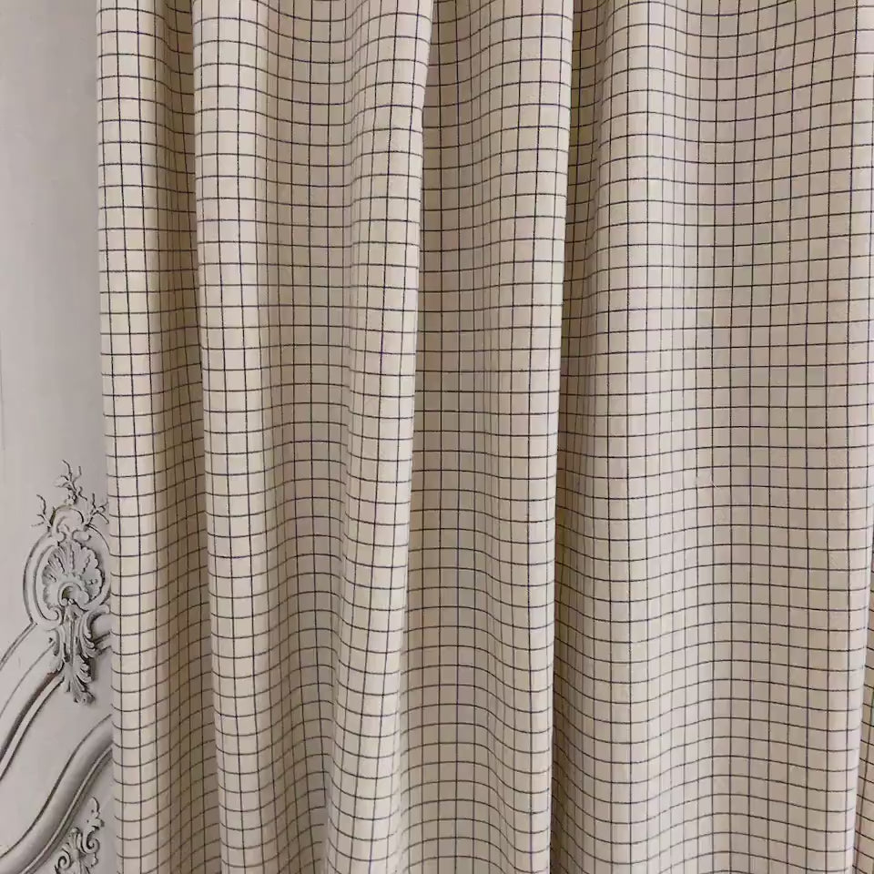 Navy Grid Check Curtain on Natural Beige