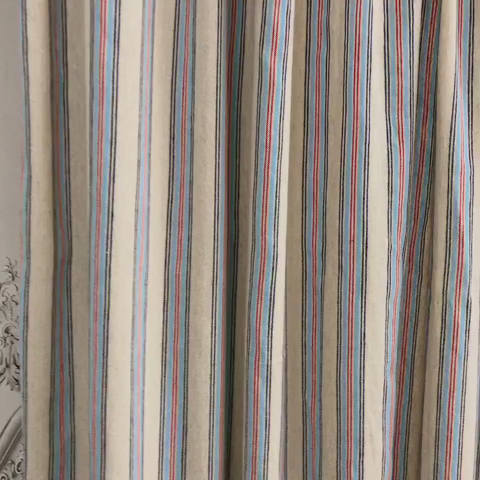Indigo Light Blue Red Vertical Stripe Curtain on Natural Beige
