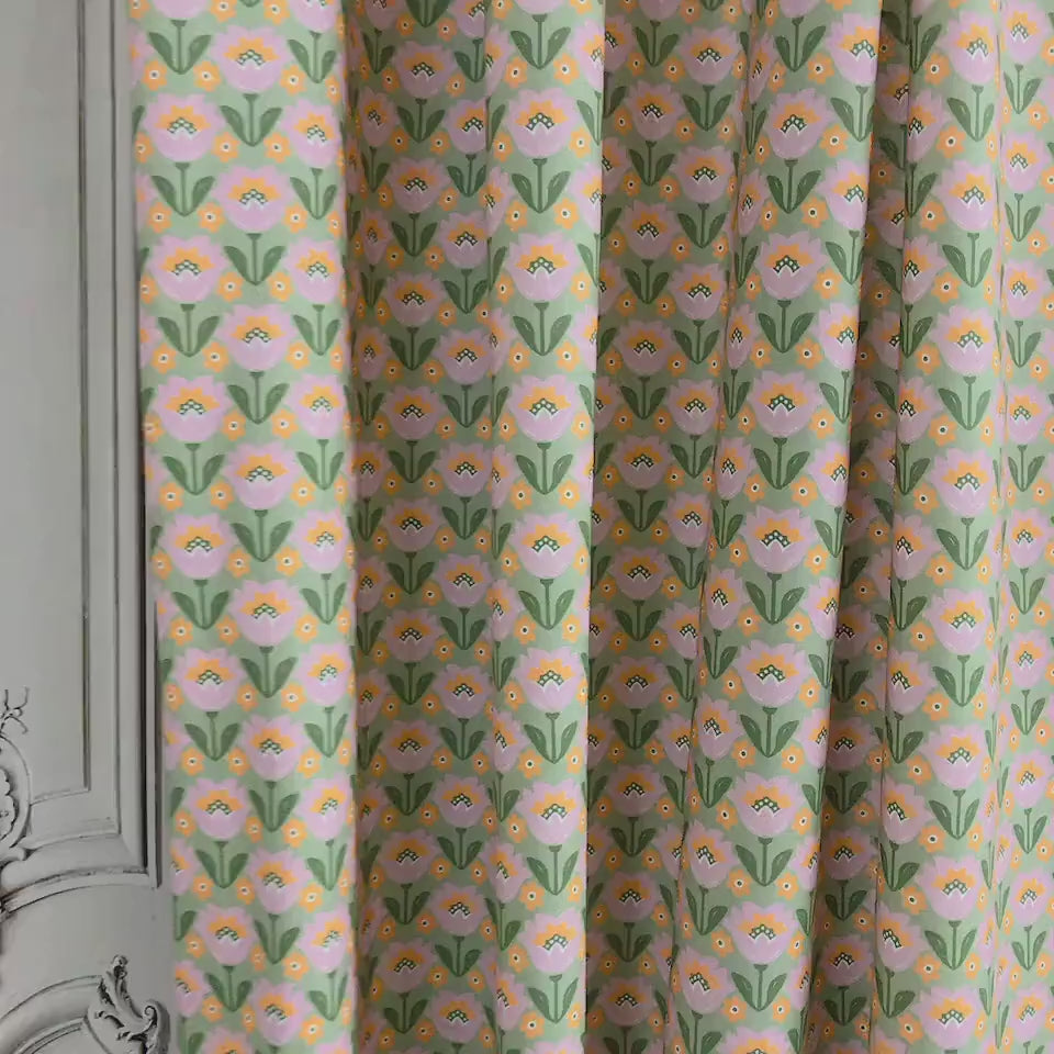 Lavender and Orange Tulip Curtain on Heritage Olive Green