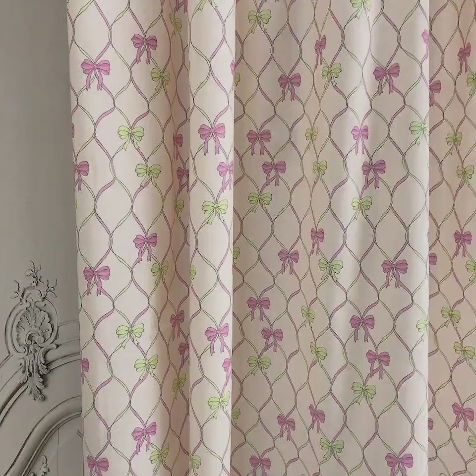 Pink Neon Green Vertical Vine Ribbons Curtain on Natural Beige